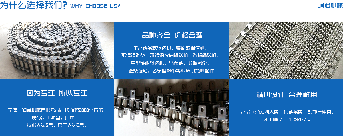 生產(chǎn)鏈條式輸送機(jī)、螺旋式輸送機(jī)、不銹鋼鏈條、不銹鋼滾軸輸送機(jī)、鏈板輸送機(jī)、重型鏈板輸送機(jī)、馬蹄鏈、長(zhǎng)城網(wǎng)帶、鏈條鏈輪、乙字型網(wǎng)帶等玻璃制瓶機(jī)配件,食品機(jī)械配件及各種網(wǎng)帶的專業(yè)廠家 ,多年來產(chǎn)品暢銷各地玻璃廠和食品廠,在玻璃制品等行業(yè)中享有較高的聲譽(yù)。公司集摸具開發(fā)、機(jī)械設(shè)計(jì)生產(chǎn),銷售于一體的生產(chǎn)型企業(yè)。生產(chǎn)的自動(dòng)化流水線金屬傳動(dòng)網(wǎng)帶、鏈條等產(chǎn)品廣泛用于玻璃機(jī)械、食品機(jī)械、化纖機(jī)械、醫(yī)藥、電子、烘干機(jī)械、輪胎機(jī)械等行業(yè)。產(chǎn)品多銷往各個(gè)城市的機(jī)械廠、食品廠和一些涉及流水線或自動(dòng)化設(shè)備的公司。